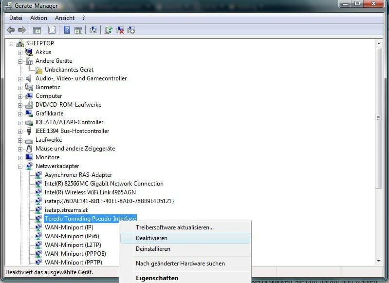 Aktivieren Sie nun im Menü unter dem Punkt "Ansicht" die Option "Ausgeblendete Geräte anzeigen". Navigieren Sie nun in der Liste zum Punkt "Netzwerkadapter". Erweitern Sie ihn, indem Sie auf das "+" klicken, und Sie sehen nun das oben angesprochene "Teredo Tunneling Pseudo-Interface". Rechtsklicken Sie nun darauf und wählen Sie "Deaktivieren". Bestätigen Sie den Warnhinweis mit "Ja", und das Gerät ist nun deaktiviert.