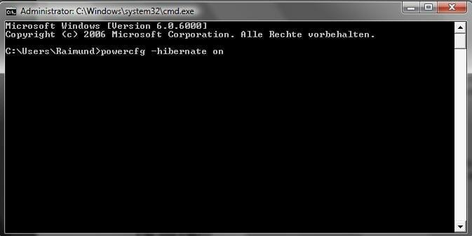 Es erscheint nun die Windows-Eingabeaufforderung. Geben Sie dort folgendes ein: powercfg -hibernate on