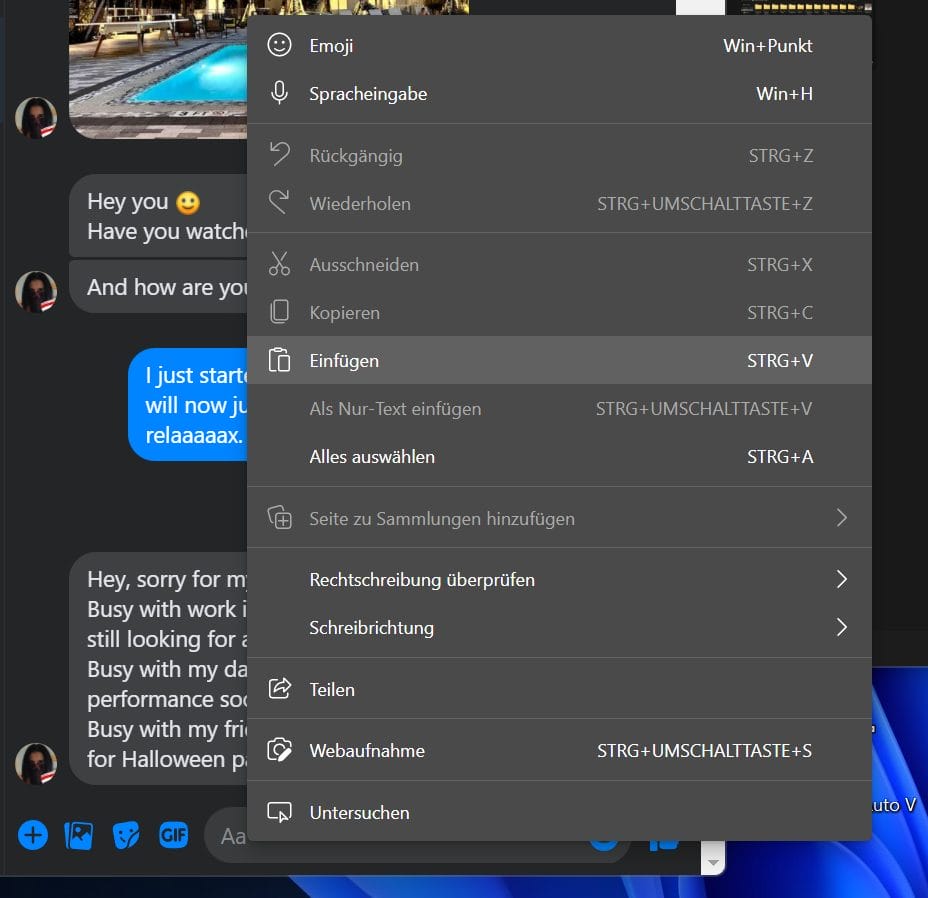 This is what it looks like when you paste the Windows 11 screenshot into Facebook Messenger after the shortcut via the context menu: