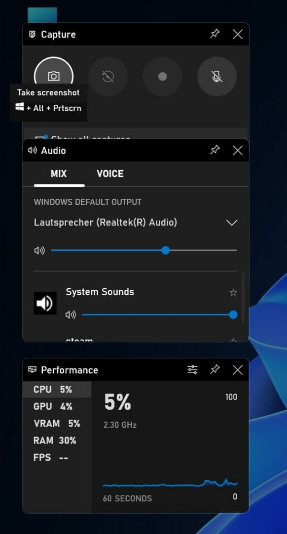 1. tap G while holding down the WINDOWS button to start the Xbox game bar (Game Bar). The following overlay will then appear: