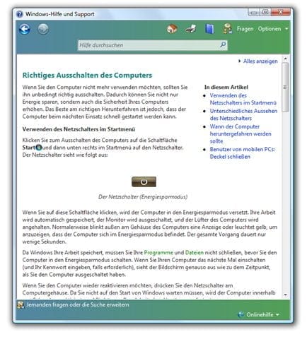 Die “Windows Onlinehilfe” führt zu http://windowshelp.microsoft.com/Windows/en-US/default.mspx, wo Microsoft sein Hilfeangebot permanent erweitert. Hier finden Sie nicht nur laufend geänderte Inhalte, sondern können¬ Profis auch direkt über die Newsgroups Fragen stellen.