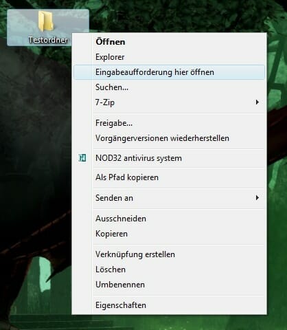 Dazu machen Sie einfach einen Rechtsklick auf den Ordner und halten dabei die Shift-Taste (Umschalttaste) gedrückt. Es erscheint ein neuer Punkt “Eingabeaufforderung hier öffnen”. Klicken Sie nun darauf, dann öffnet sich eine neue Shell, die praktischerweise gleich auf diesen Pfad zeigt.
