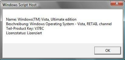 Warten Sie nun einen kurzen Moment und es erscheint ein Fenster des Windows Script Hosts, indem die benötigten Informationen enthalten sind.