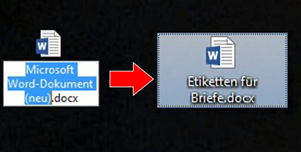 Im Anschluss erstellt Windows automatisch auf dem Desktop ein Word-Dokument. Allerdings ist das noch unbenannt oder heißt besser gesagt „Microsoft Word-Dokument (neu)“. Das kann man so stehen lassen und mit einem Klick auf die linke Maustaste auf den leeren Desktop bestätigen, oder aber ins Textfeld unter dem Icon klicken und das Dokument mit einem korrekten Namen versehen. Das sieht dann so aus wie in unserem zweiten Bild.