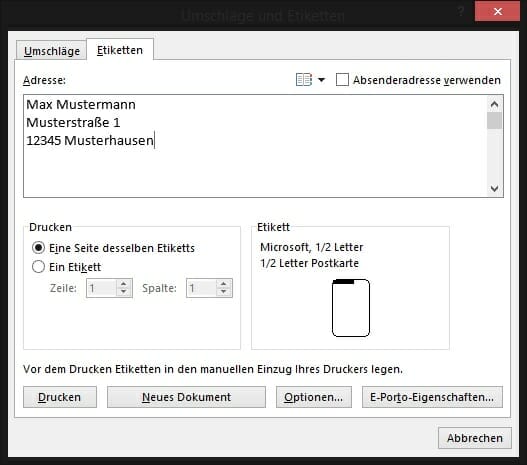 In der allereinfachsten Variante, bei der man nur das Etikett für einen einzelnen Empfänger erstellen möchte, sieht die Sache ganz easy aus: Man klickt in das Fenster unterhalb von „Adresse“ und gibt dort ganz einfach Namen und Adresse des Empfängers ein. Mit einem weiteren Klick der linken Maustaste auf den untenliegenden Button „Neues Dokument“ öffnet Word dann automatisch ein weiteres Dokument, in dem das Etikett bereits mitsamt der Adresse vorformatiert eingefügt wird. Das kann man nun entweder drucken oder wie gewohnt über die Registerkarte „Datei“ und dann „Speichern unter“ abspeichern.