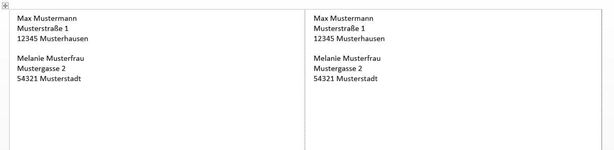 Will man jedoch mehrere Etiketten erstellen, kann man auch so verfahren, dass man in das Adressfeld mehrere Empfänger untereinander hineinschreibt, durch einen Absatz voneinander getrennt. Würde man das dann auf die zuvor beschriebene Art und Weise als neues Dokument einfügen, sähe es auf dem Bildschirm folgendermaßen aus.