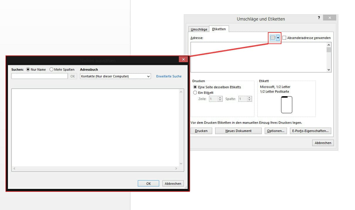Die letzte Möglichkeit bezieht sich auf all jene, die nicht nur eine Handvoll an Adressen mit Briefen zu bedenken haben und diese nicht manuell eintippen möchten. Auch für diesen Fall gibt es im Etiketten-Fenster die Möglichkeit, durch einen Klick auf das Adressbuch-Symbol seine Kontakte einzufügen – allerdings funktioniert das nur, wenn man eine solche Liste auch auf seinem Computer (etwa via Outlook) hat. Mit der linken Maustaste kann man diese nun auswählen bzw. einzelne Abwählen. Sie werden dann automatisch ins Adressfeld eingefügt und können von dort aus dem Dokument hinzugefügt werden.