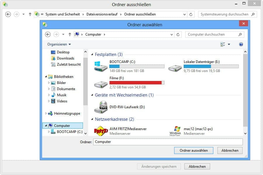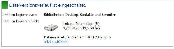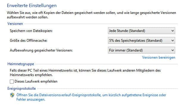 2. now select "Select drive" and decide on the backup drive for saving the files. Click on "OK". Back in the file version history window, click on "Switch on". The message "File version history is switched on" appears. Windows 8 will now save all files and folders in your libraries, in the SkyDrive folder and on the desktop, as well as the Internet Explorer bookmarks.