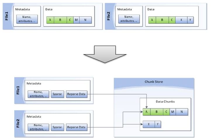 Findet das Dateisystem zwischen zwei (wie oben dargestellt) oder mehr Dateien doppelt vorhandene Datensätze, werden sie in den so genannten "Chunk Store" kopiert. Beim Zugriff auf die Dateien, werden nur die individuellen Metadaten ausgelesen, der Rest erfolgt vom Chunk Store. Ganz klar: Das spart nicht nur Bandbreite, sondern auch eine ganze Menge Speicherplatz! Stellen Sie sich mal eine virtuelle Serverfarm von 20 VHDs vor, die kaum mehr Speicherplatz benötigen als 1!