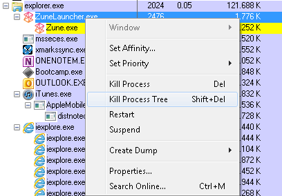 In the list of your programs, you can also find out which process is dependent on which. Or which process was started by another. So if a process cannot be terminated, you should first try the process that depends on it! Simply right-click on it and click on "Kill Process" or - to kill the dependent processes - on "Kill Process Tree".