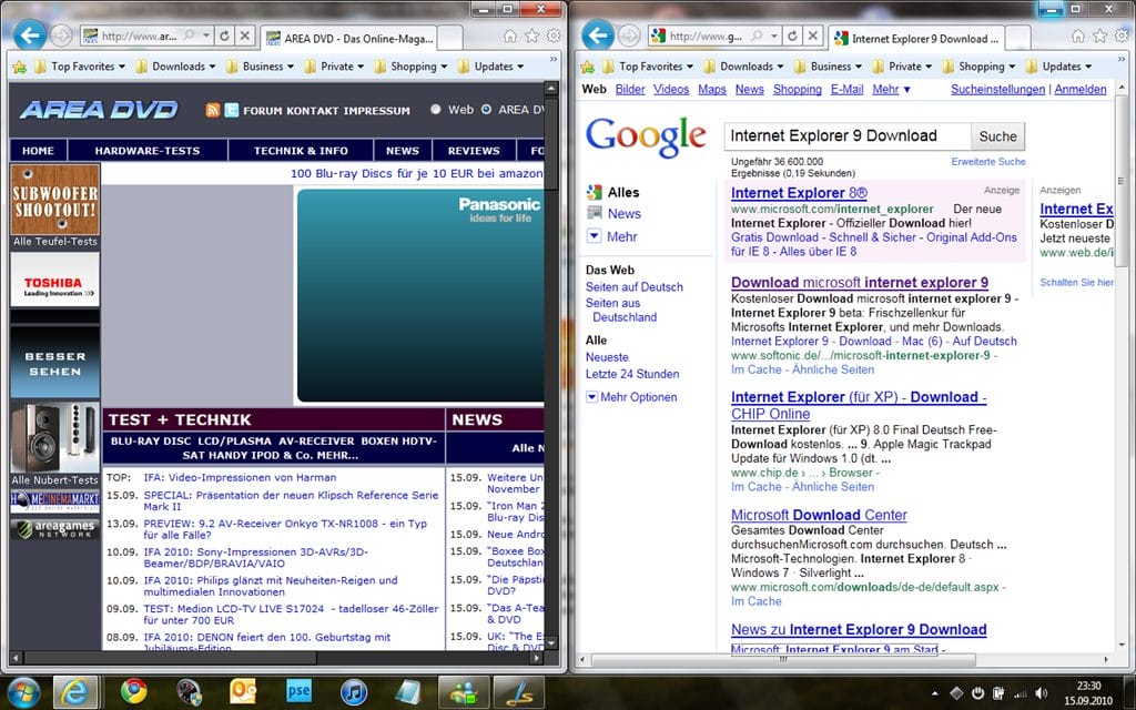 Sofort missfällt die Aufsplittung zwischen Tabs und Suche im "Kopfbereich" des Internet Explorer 9 – statt untereinander (wie bei Chrome oder Firefox) sind diese wichtigen Funktionen nebeneinander angeordnet. So bleibt weder für das eine noch das andere genug Platz zum effektiv arbeiten.