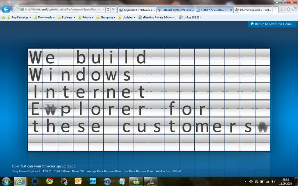 Die Internet Explorer 9 Beta nutzt Ihre Grafikkarte zur Beschleunigung von Text und Bild im Browser. Wie gut das funktioniert, können Sie auf den IE9 Demo Webseiten ausprobieren!
