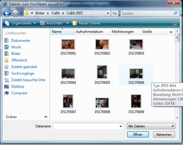 Zuerst wählt man die hochzuladenen Dateien aus.