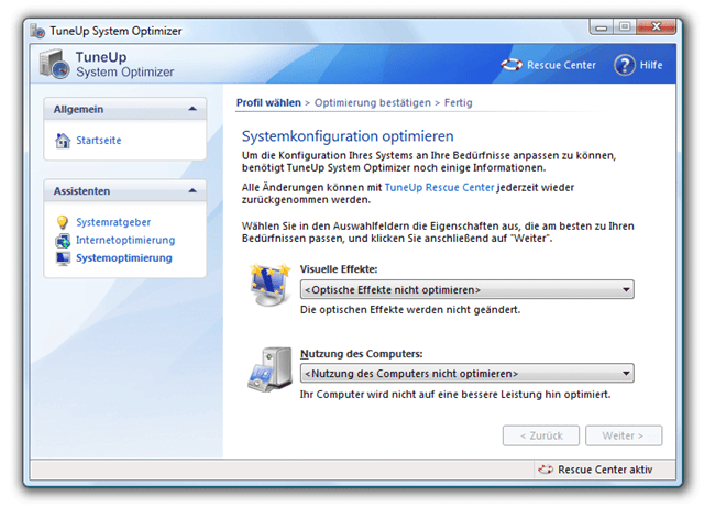 Direkt wechselte ich zur "Systemoptimierung" und war sehr gespannt. Unter "Visuelle Effekte" entschied ich mich für "Maximale Leistung", da auf öffentlichen Computern sowieso niemand auf das Aussehen schaut und die Geschwindigkeit definitiv im Vordergrund steht. Bei "Nutzung des Computers" wählte ich "Computer mit Netzwerk- und Internetanbindung". Nachdem alle empfohlenen Optimierungen durchgeführt wurden, war ein Neustart fällig. Und wieder war ich überrascht: Das System reagierte schon deutlich schneller. Natürlich optimierte ich mit Hilfe der "Internetoptimierung" auch gleich noch die Verbindung, sodass der Internet Explorer beispielsweise deutlich mehr Verbindungen zu einem Server vornehmen kann.