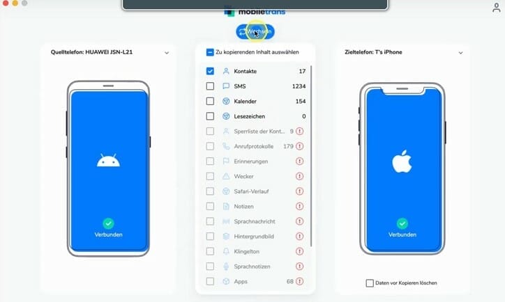 Schritt 2: Jetzt hast du deine beiden Handys angeschlossen und bist schon fast bereit, die Daten zu übertragen. Die Anwendung erkennt jetzt deine beiden Handy und markiert diese im Vorhinein bereits als Quell- oder Zielgerät. Falls diese Einstimmung nicht stimmt, kannst du dies auch schnell wechseln. In diesem Bereich kannst du jetzt auch die Arten von Daten auswählen, die du übertragen möchtest.