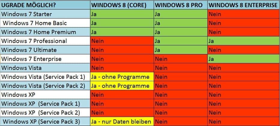 Only Windows 7 allows upgrades that take all existing programs, settings and personal files with them to the new Win 8. Under Vista, the installed software is lost during the upgrade. XP only retains its own files. Here is the upgrade overview: