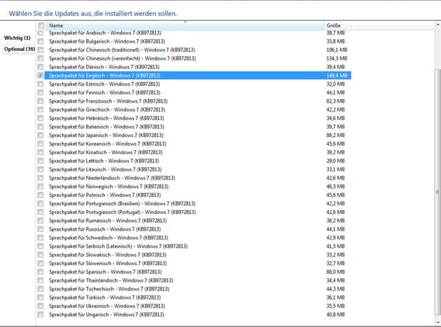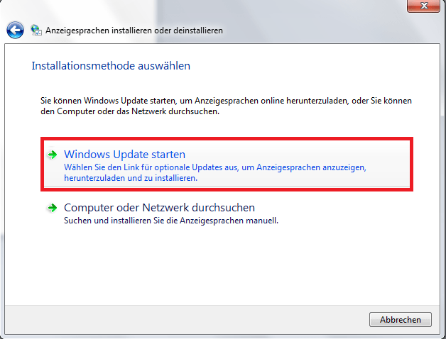 Windows now asks whether to search for available language packs via the update function, on the computer or in the network. Select the Windows Update here.