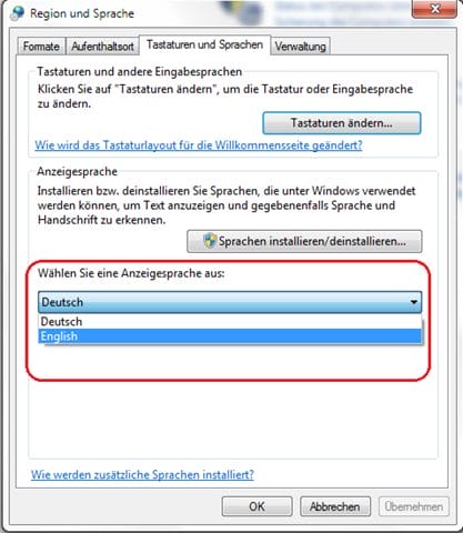 Navigate in the 'Control Panel' via the function 'Time, language and region' to the sub-item Change display language.
