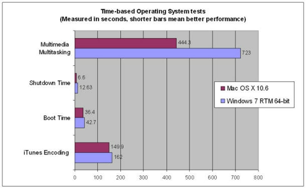 As expected, Mac OS X performed better. After all, the hardware, applications (e.g. iTunes, Cinebench and QuickTime) and operating system are perfectly matched. Only in terms of gaming performance does Windows 7 clearly outperform MacOS X.