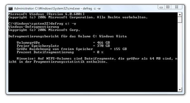 3. Bestätigen Sie noch mit "Fortsetzen", damit die Kommandozeile erscheint. Geben Sie hier folgenden Befehl ein: "defrag c: -w". Drücken Sie dann Enter. Auf diese Weise wird die gründliche Defragmentierung für das Laufwerk C: ausgeführt, wo sich meist alle Programme und Windows-Dateien befinden. Wenn Sie im Anschluss Laufwerk D: defragmentieren möchten, tippen Sie einfach "defrag d: -w" ein und drücken Enter.