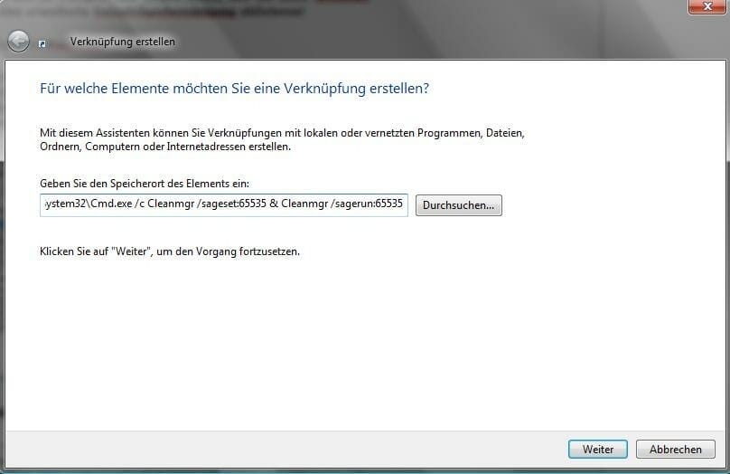 Klicken Sie dazu mit der rechten Maustaste auf den Desktop und wählen Sie "Neu/Verknüpfung". Geben Sie nun im folgenden Fenster folgendes ein: "%SystemRoot%System32Cmd.exe /c Cleanmgr /sageset:65535 & Cleanmgr /sagerun:65535".