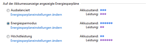 2. Prozessorgeschwindigkeit herunterregeln:  In modernen Notebooks werkeln sehr leistungsfähige Prozessoren mit Mehrkernarchitektur und Geschwindigkeiten jenseits der 2 Ghz-Grenze. Obwohl diese auf möglichst stromsparendes Verhalten ausgerichtet sind, können Sie die Prozessorleistung im mobilen Einsatz deutlich reduzieren. In den meisten Fällen reicht selbst die niedrigste Einstellung bei modernen Laptopts noch für die üblichen Officefunktionen oder das Abspielen von DVDs. Und so geht's: Klicken Sie auf das Akkusymbol in der Taskleiste und wählen Sie „Weitere Energieoptionen“. Markieren Sie nun "Energiesparmodus" und wählen Sie hier "Energiesparplaneinstellungen ändern".