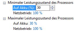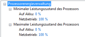 Now click on "Change advanced energy settings". The "Energy options" window will now appear. Scroll down here until you see "Processor power management". Expand this by clicking on the "+" sign. Now first expand "Minimum performance status of the processor". Now enter the value "On battery" for "0%". Also enter "Maximum performance status of the processor" as "0%".