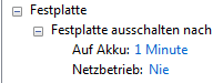 3. Festplatte automatisch abschalten: Ebenfalls in den „Energieoptionen“ setzen Sie unter „Festplatte“ die Option „Festplatte ausschalten nach“ auf „1 Minute“ (Auf Akku), damit während der DVD-Wiedergabe oder dem Tippen einer E-Mail die akkuhungrige Festplatte sich zur Ruhe setzen kann. Dies spart im Regelfall zwischen 3 und 5% Akkulaufzeit, da die mechanischen Bauteile der Festplatte (z.B. Spindeln, Schreib-/Lesekopf)