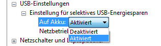 5. USB-Anschlüsse im Energiesparmodus: Wechseln Sie nun nach "USB-Einstelungen/Einstellungen für selektives USB-Energiesparen". Hier können Sie mit Hilfe des Eintrags "Aktiviert" bestimmen, dass USB-Anschlüsse nur dann mit Energie versorgt werden, wenn ein Gerät angeschlossen UND aktiv ist. Besonders angeschlossene Geräte (z.B. USB-Sticks, Festplatten, Mäuse, LED-Lampen) benötigen sehr viel Energie, was sich negativ auf die Akkulaufzeit auswirkt. Es ist daher empfehlenswert, wenn möglich, mobil komplett auf (unnötige) USB-Geräte zu verzichten.