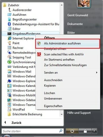If you receive an error message about insufficient access rights, you must start the Command Prompt with administrator rights. To do this, right-click on Command Prompt and then on Run as administrator.